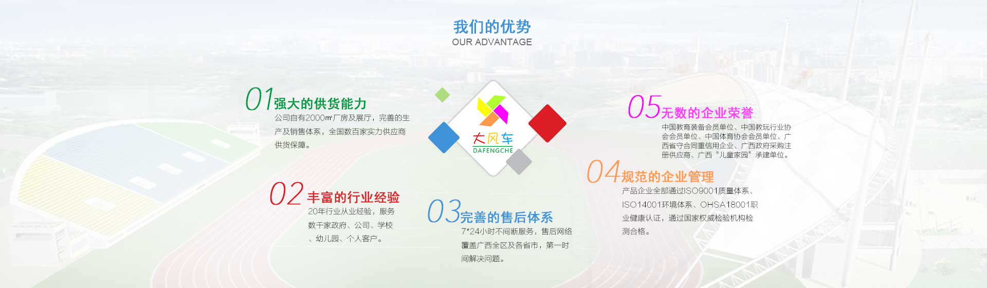 大風車游樂設備公司主營廣西南寧兒童戶外組合滑梯、幼兒園桌椅床柜、樹屋滑梯、定制滑梯、木質滑梯、大型戶外玩具、幼教設施、幼兒園一站式設備采購、幼教玩具、游樂設備、戶外拓展設備、健身器材、淘氣堡、體育設施、公園小區景觀園林配套設施、幼兒園整體設計裝修、室內外游樂場地整體規劃與設計及各類非標定制游樂設備,公司產品生產均通過ISO體系認證、3C認證、及“國家質量監督檢驗中心”檢測合格,公司是廣西壯族自治區政采云采購注冊供應商,同時還獲得全國綜合信用評估中心頒發的“采購優質供應商”、“AAA級企業信用等級認證”、“AAA級誠信經營示范單位認證”及“AAA級質量服務信譽認證”。